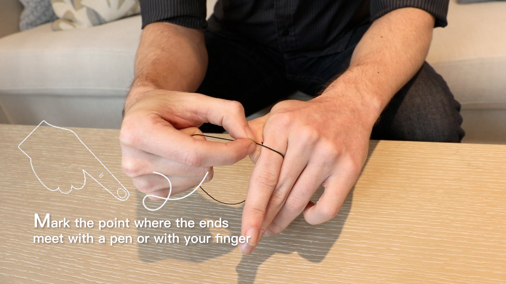 步驟1. 將線環繞需測量的手指最粗的位置,在線的交會處做記號。*請注意,記得使用沒有彈性的線,也不要拉太緊喔!
