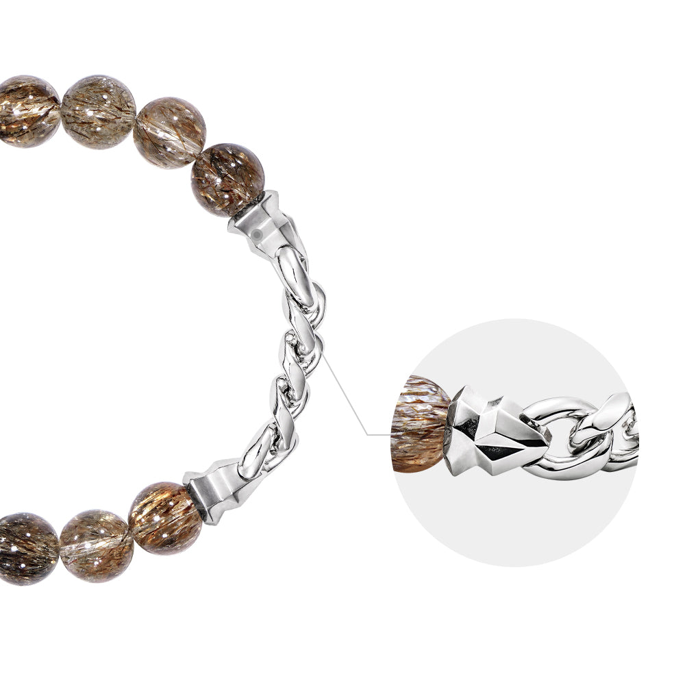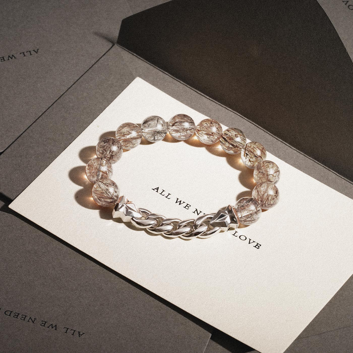 混沌與秩序的邊界消失於腕間。巴西深處的礦脈孕育了這些不可思議的水晶奇蹟——金黑色絲線如宇宙亂流般穿透透明基質。