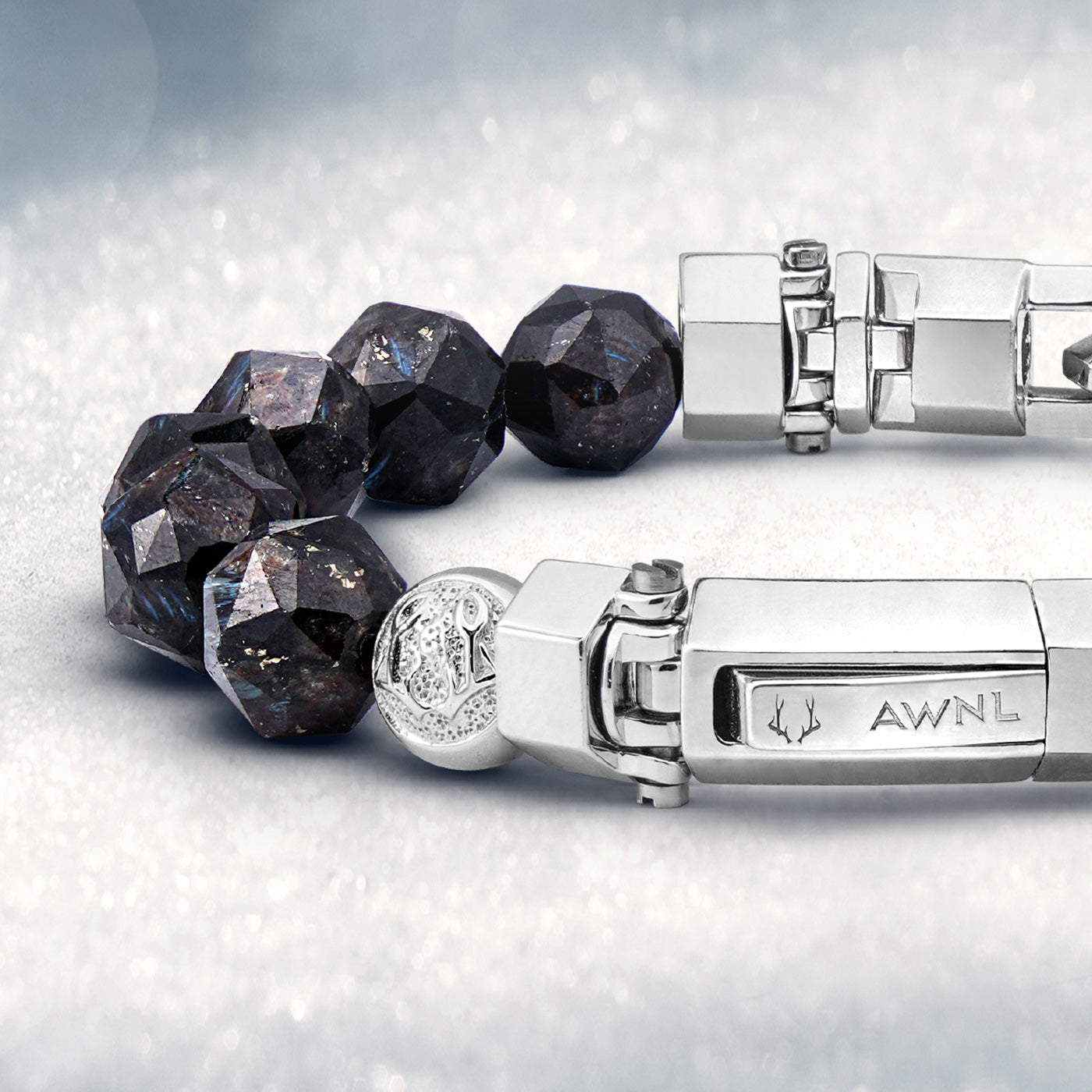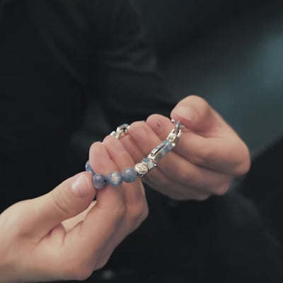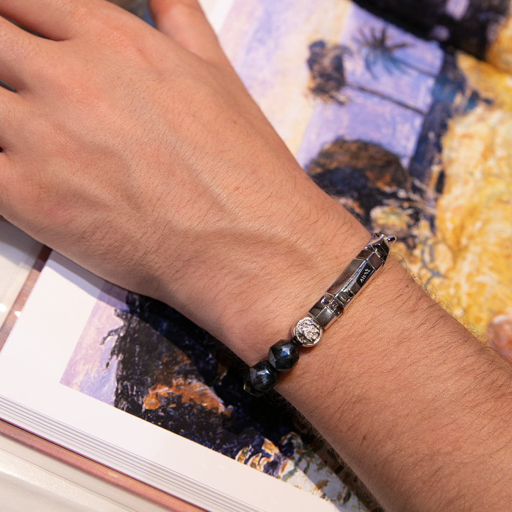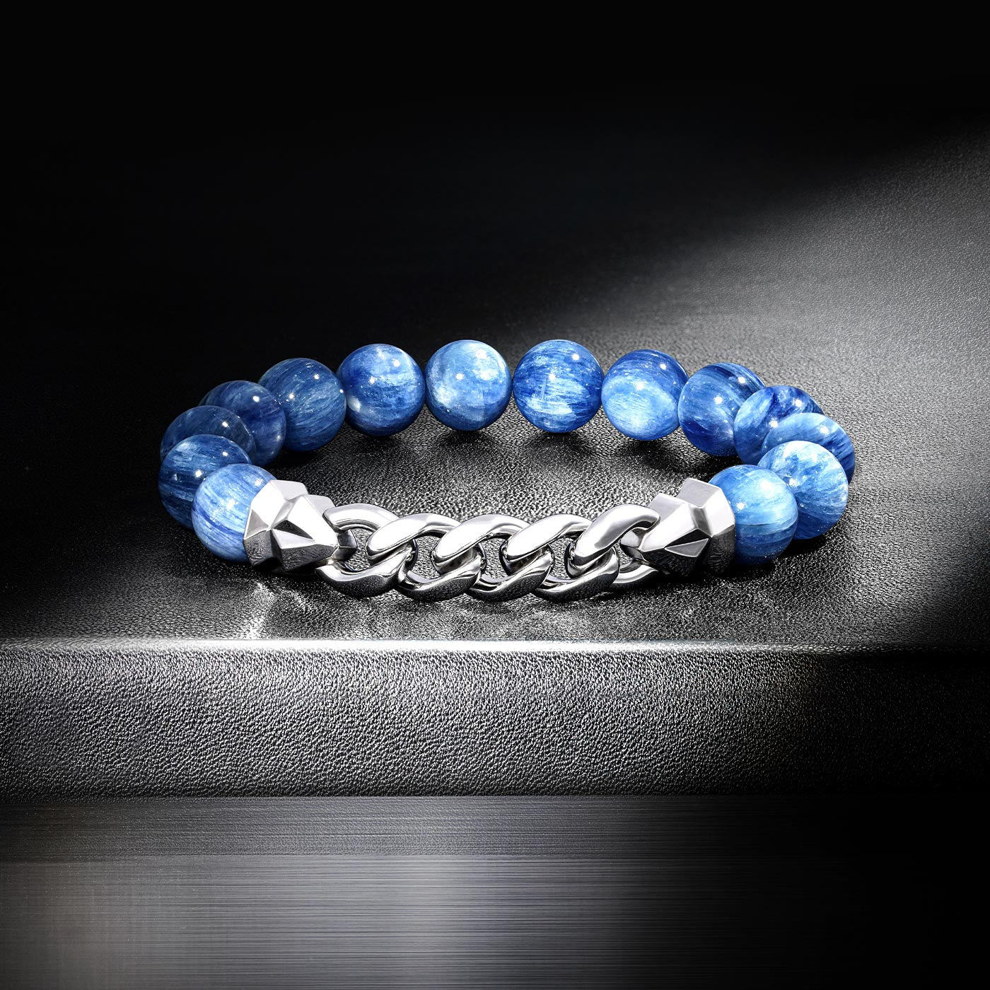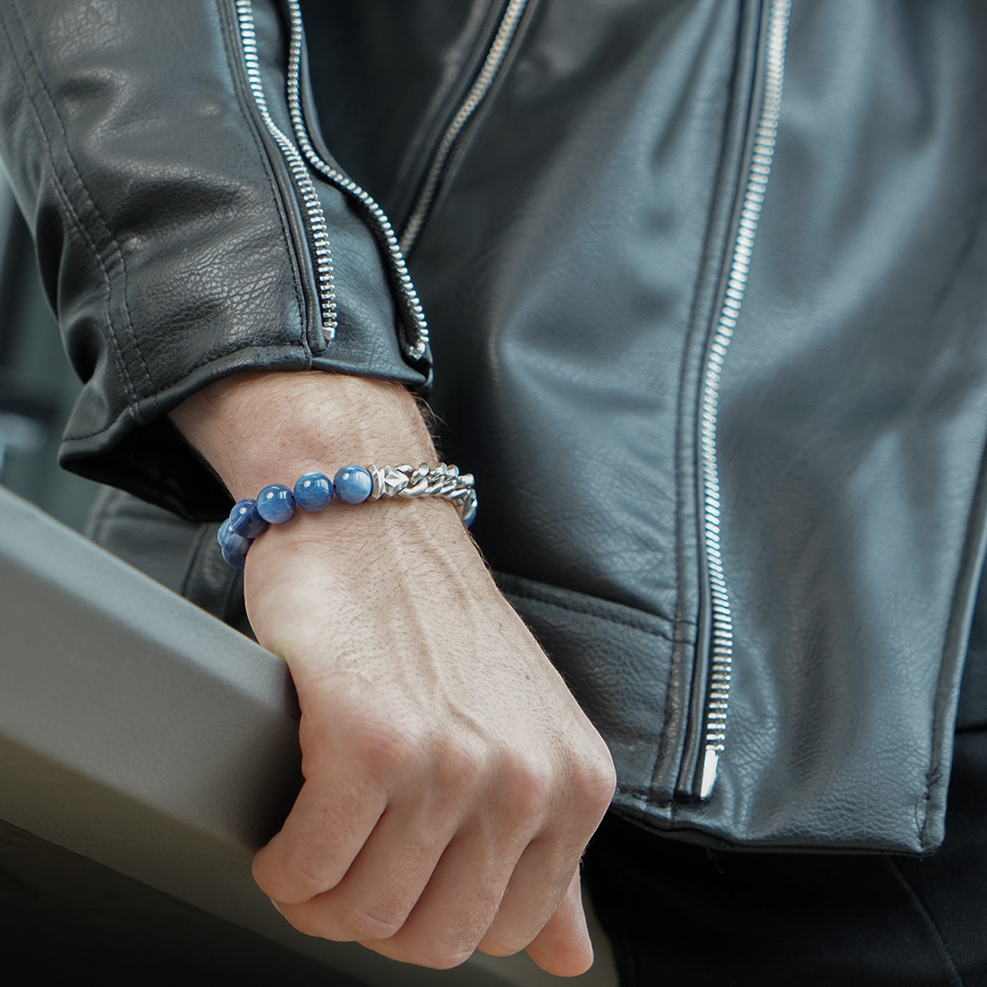 融匯東方神秘與義式奢華——AWNL 藍晶石半銀鍊男士手鍊,半銀鍊半水晶設計,打破傳統侷限。獨特的雙材質結合,完美詮釋現代紳士的多元特質,為日常配飾帶來全新可能。