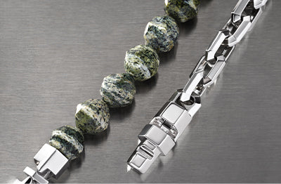 源自東西方美學的交界,「Beads & Links」系列以晶石與鏈節的雙重結構,重塑男性飾品的視覺語言與佩戴邏輯。天然晶石保留有機紋理與能量語境,金屬鏈節則以幾何節奏注入秩序與剛性,二者於腕間對話,實現剛柔並進的平衡設計。