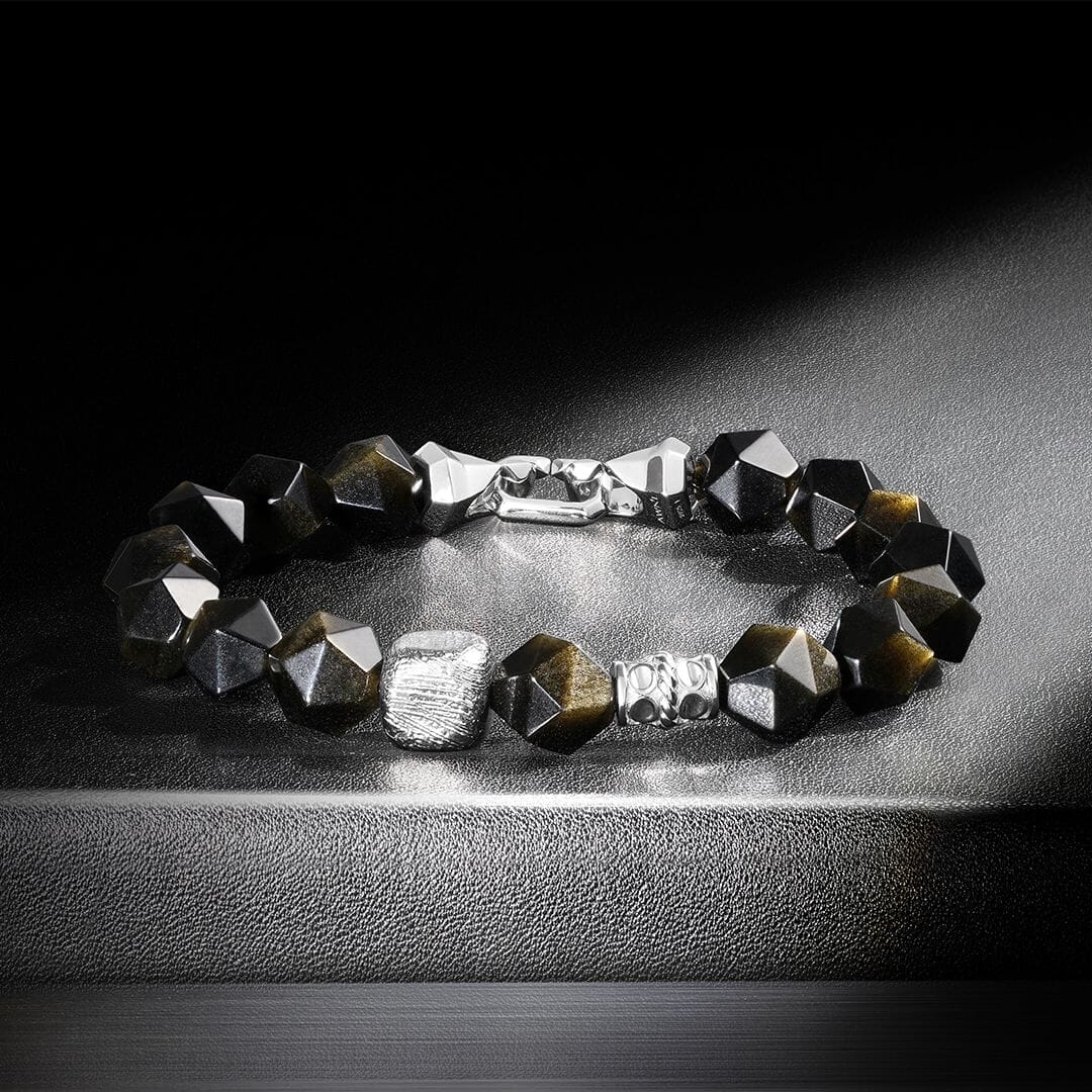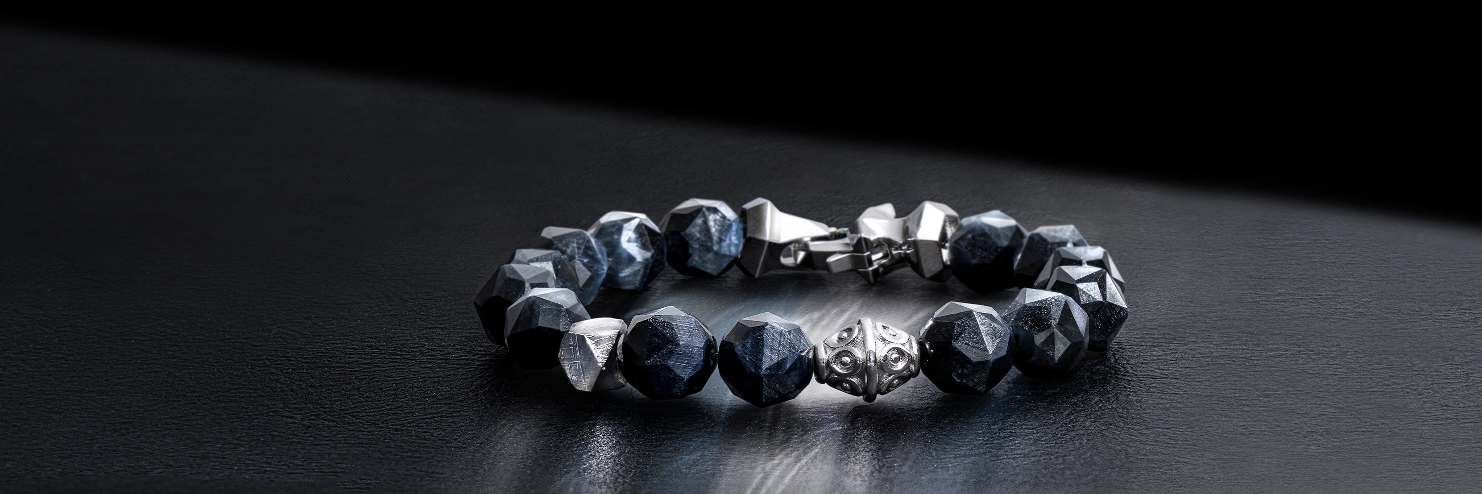融匯東方須彌與北歐維京力量,嚴選瑞典珍稀M隕石與南非鷹眼石,以極致工藝打造當代紳士配飾,在腕間綻放繁星般奢華光彩。