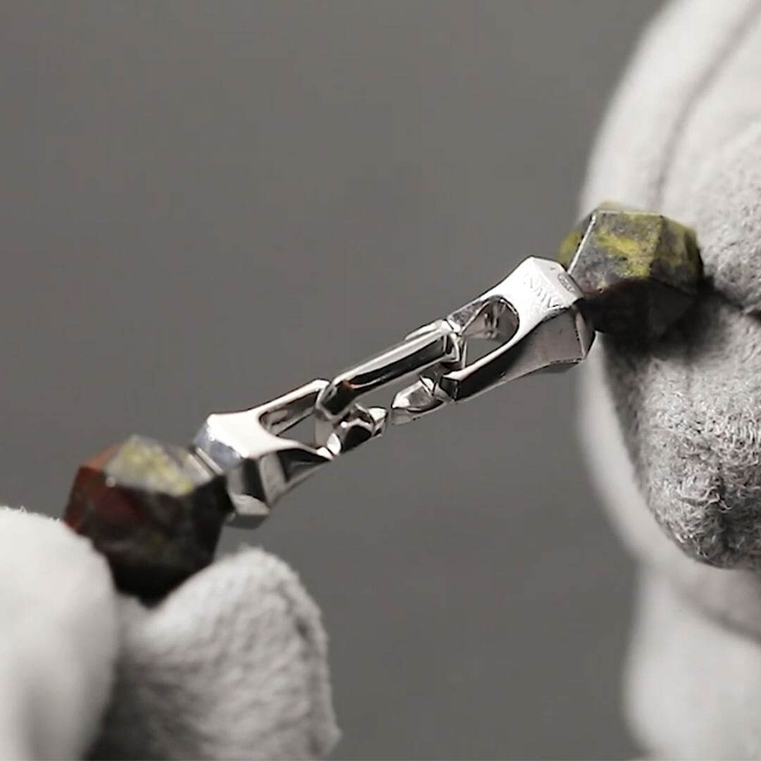 8毫米的珠徑提供了恰到好處的存在感,既不過分張揚,又有足夠的視覺重量。石珠間的銀質隔珠創造出視覺節奏,同時確保每顆寶石都能獨立展現其光彩。連接處採用加固設計,平衡了美學與實用性。。