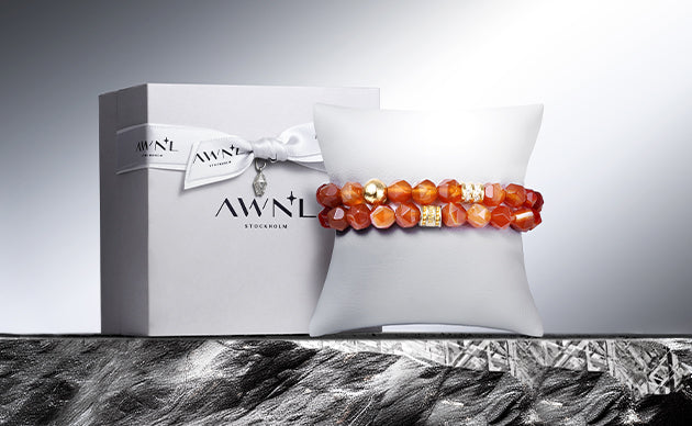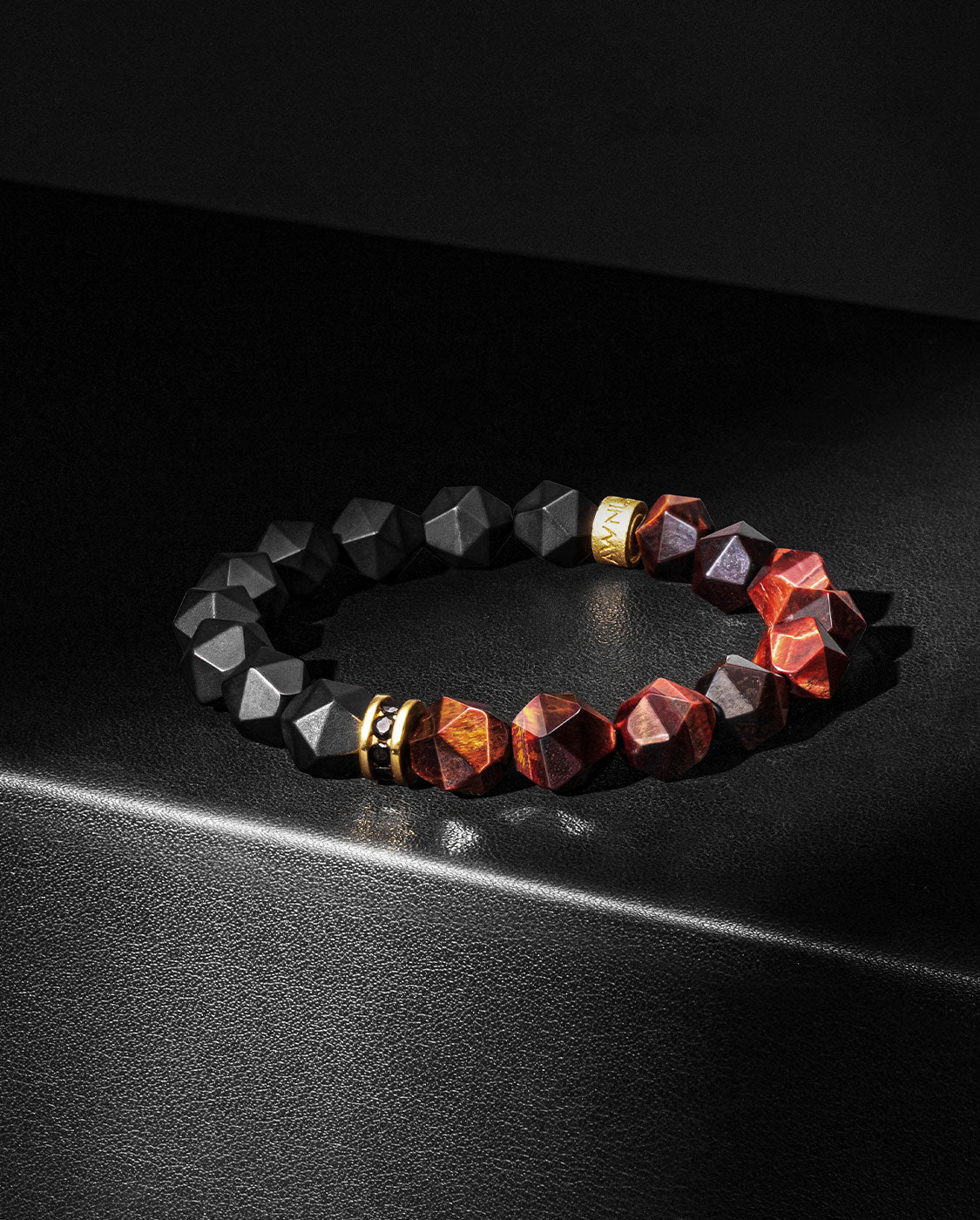 可調節的編織繩設計確保舒適貼合,黑色繩身與紅褐色石材形成鮮明對比,進一步強化視覺張力。