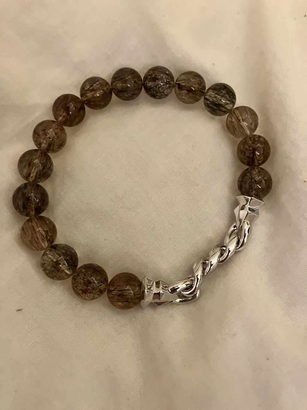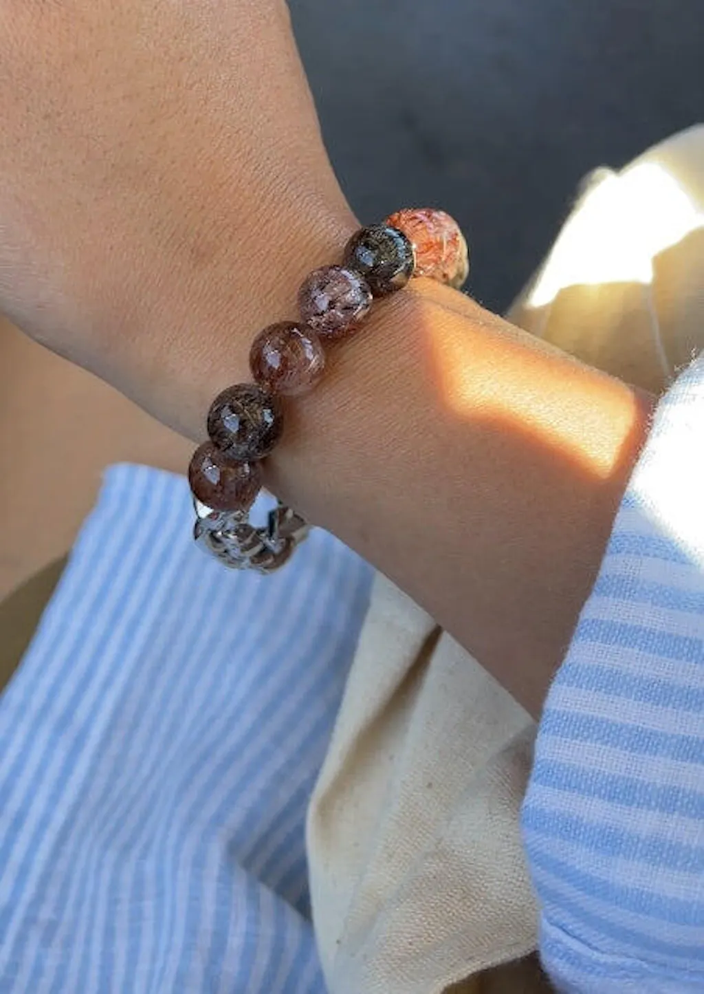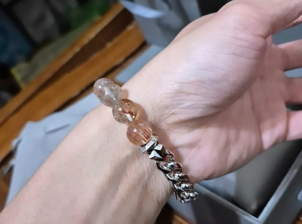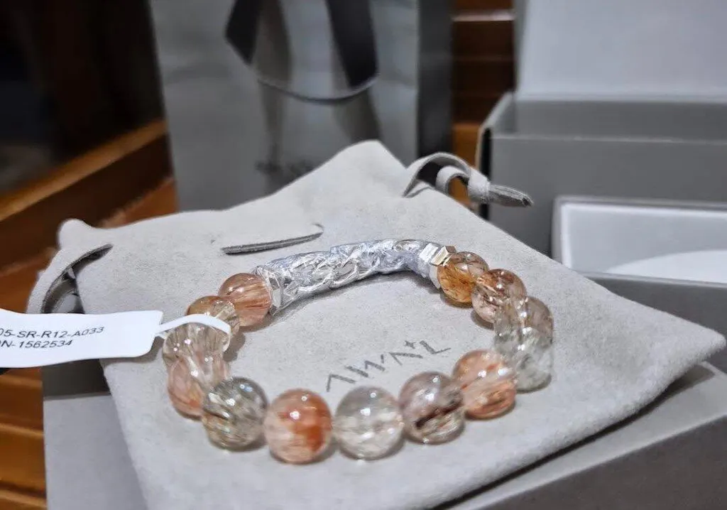 混沌與秩序的邊界消失於腕間。巴西深處的礦脈孕育了這些不可思議的水晶奇蹟——金黑色絲線如宇宙亂流般穿透透明基質。