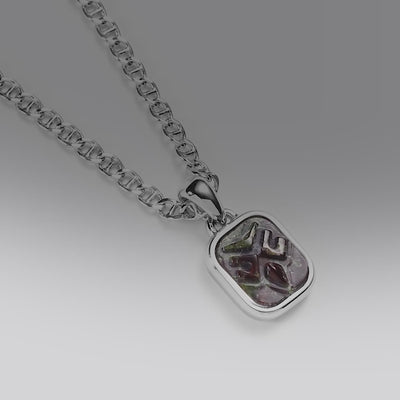 銀質邊框採用簡潔直圓角設計,與貓頭鷹圖案的幾何風格相呼應,打造出富有建築感的整體結構。項鍊選用側日字鏈,不同於常見麻花鏈,其平整的表面在光線下呈現出穩定的反射,與吊墜的幾何感相得益彰。50厘米的鏈長使吊墜在胸前形成視覺中心。