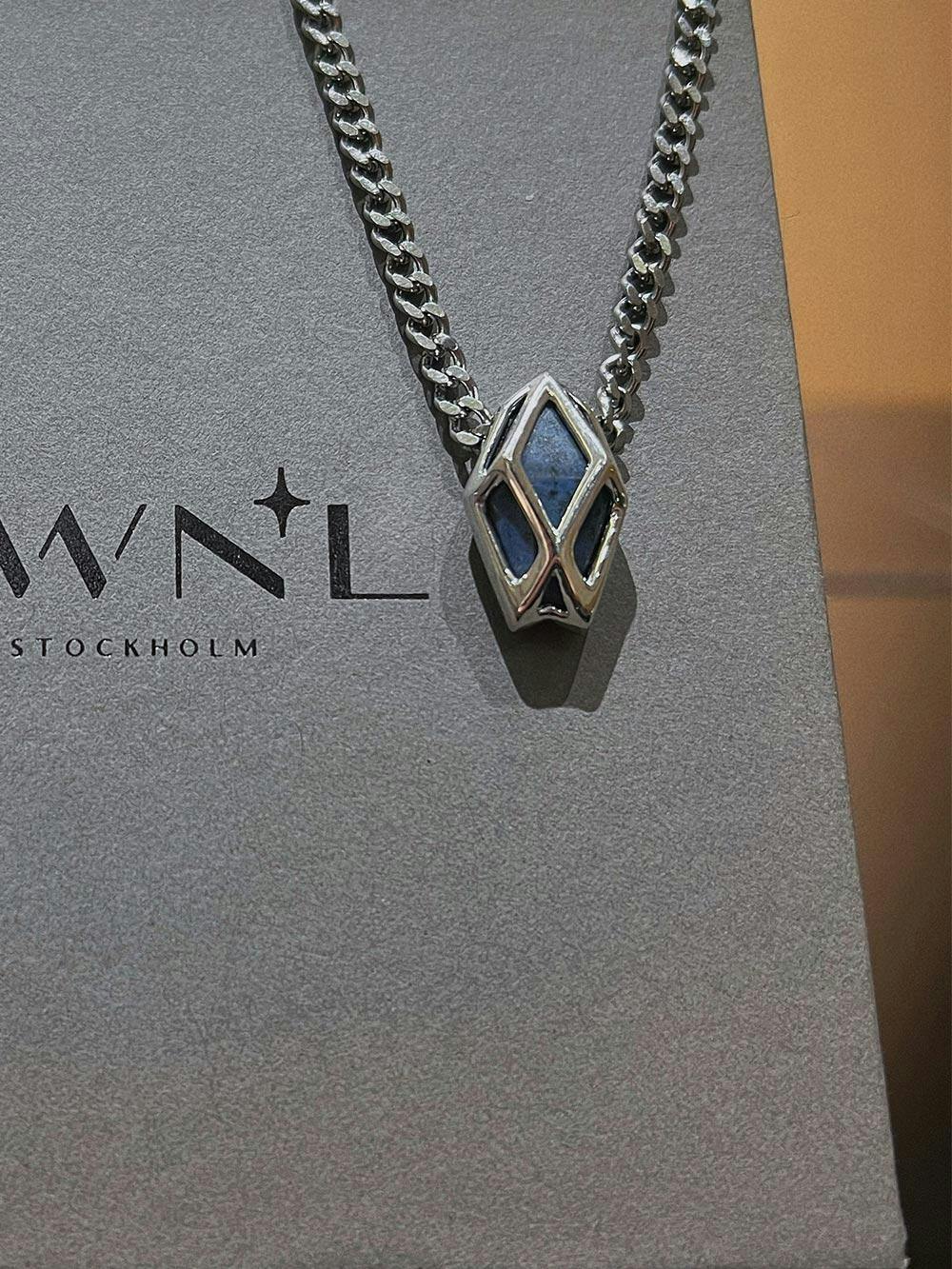 這款項鍊以品牌經典晶石Logo為設計元素,結合前衛獨特的幾何立體結構,展現現代感與精緻美學。整體造型巧妙融入獨特切面的馬達加斯加藍線石,閃耀出迷人的光彩,以其獨特的紋理和精湛的切割工藝,象徵著神秘力量與堅韌守護的寓意。