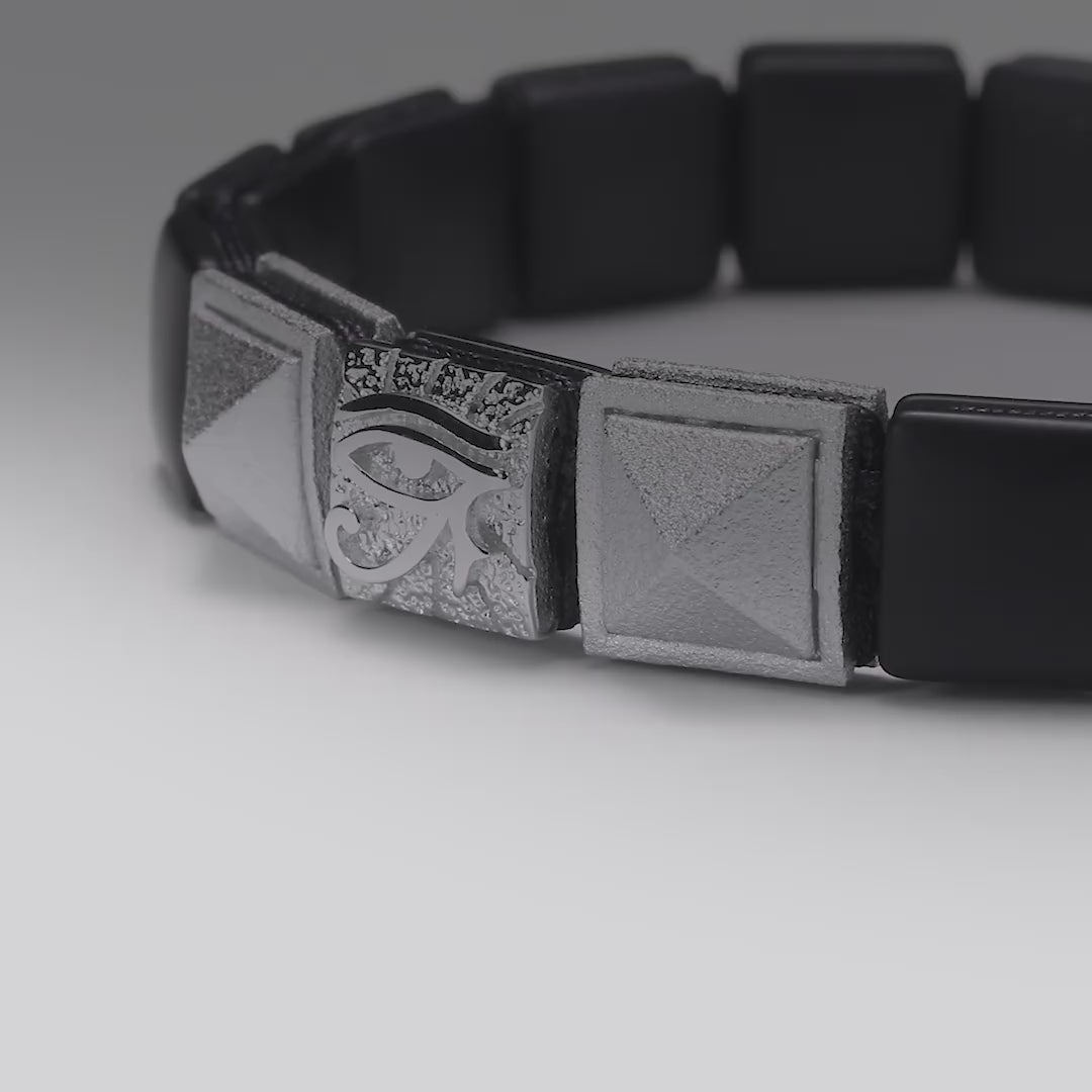 視覺焦點在於正中央精雕的荷魯斯之眼,源自古埃及的守護圖騰,寓意著洞察力、智慧與全方位的庇佑。兩側輔以立體金字塔鉚釘設計,將古老文明的幾何美學融入現代銀飾工藝。經過做舊處理的銀件紋理與黑瑪瑙的溫潤觸感形成強烈對比,在腕間構建出一段關於時間與信仰的微縮敘事。