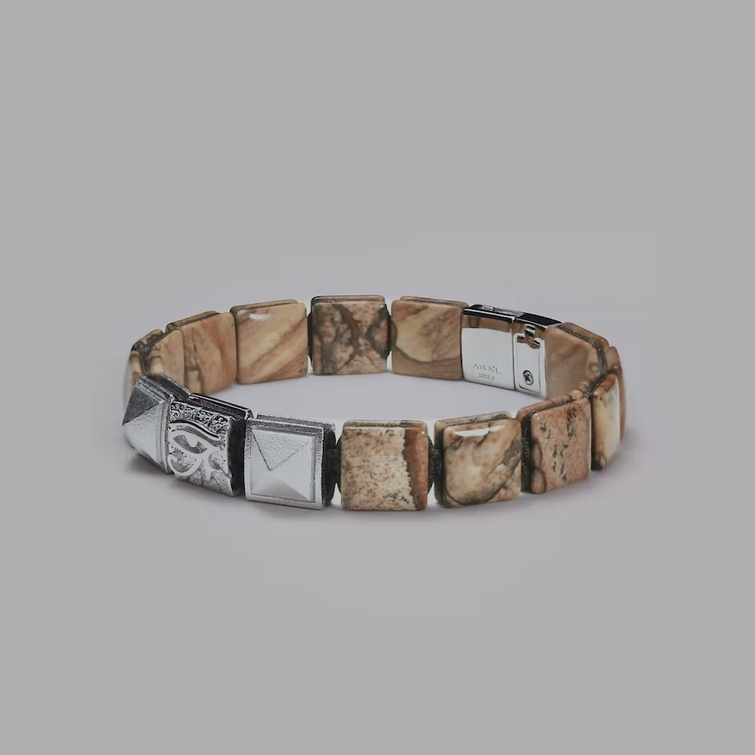 純銀精雕的荷魯斯之眼,源自古埃及的守護圖騰,寓意著洞察力、全知與庇佑。兩側輔以立體金字塔鉚釘,將古文明的神祕符號轉化為現代銀飾的幾何語言。經過噴砂處理的金屬質感與圖畫石的天然紋路相互輝映,在腕間構建出一種粗獷而精緻的歷史厚度。