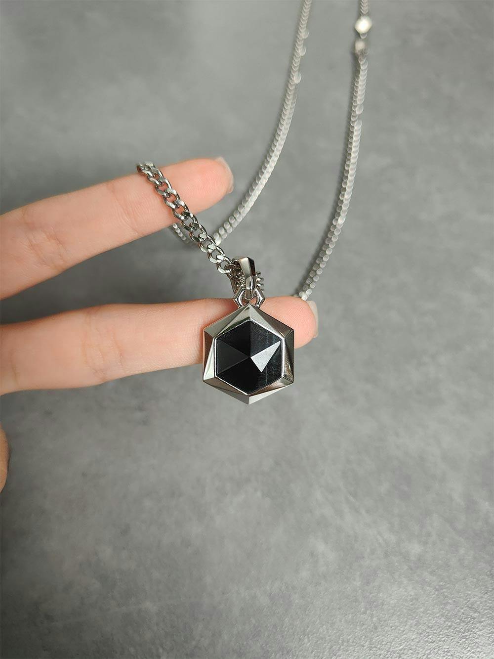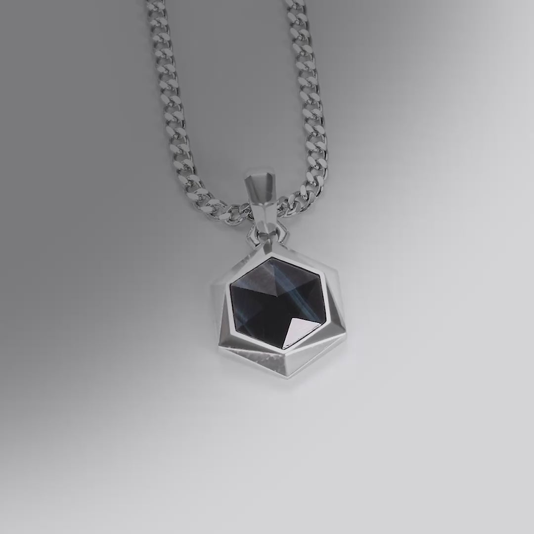 六角形設計源於實用幾何學。這種形態在自然界頻繁出現,從蜂巢到玄武岩柱,六邊形結構都提供了最佳的強度與空間效率。以六芒星盾為意象,墜飾採用純銀立體六角框,勾勒出俐落銳利的線條,內嵌南非鷹眼石,深邃如暗夜星辰的藍黑光澤,隨光線流轉間展現如鷹眼般銳利的光芒,展現極致工藝之美,詮釋新世代紳士的睿智與遠見。
