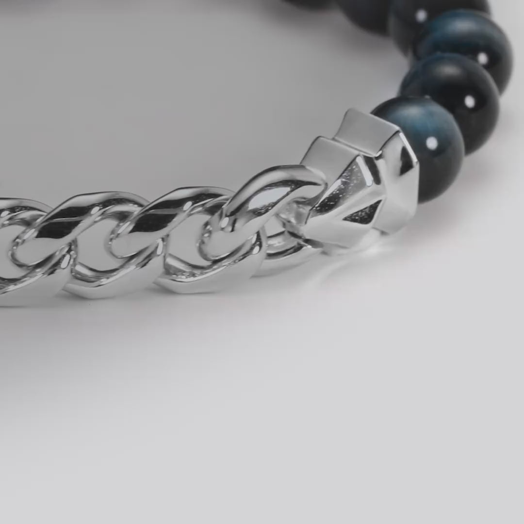 融匯西方工藝與東方智慧——AWNL 南非鷹眼石半銀鍊男士手鍊,半銀鍊半水晶設計,突破常規界限。獨到的雙材質組合,完美演繹當代紳士的雙重性格,為腕間藝術開創嶄新視界。