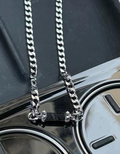 銀質粗鏈與中央黑髮晶墜飾形成視覺平衡。銀鏈的光亮冷冽反映外界,而髮晶的黑暗吸收所有入侵的光線。光明與黑暗、反射與吸收、構成無聲的物質對話。