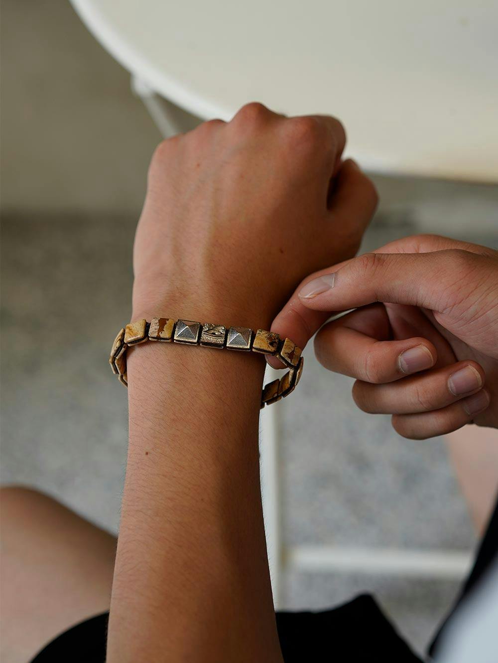手鍊所採用的南非圖畫石,每一顆寶石的紋路和顏色都獨特不同,宛如一幅幅獨特的圖畫,在光線的照耀下閃耀著迷人的光芒。每一顆寶石都經過工匠精心打磨,形狀獨特,為手鍊增添了立體感和視覺吸引力。