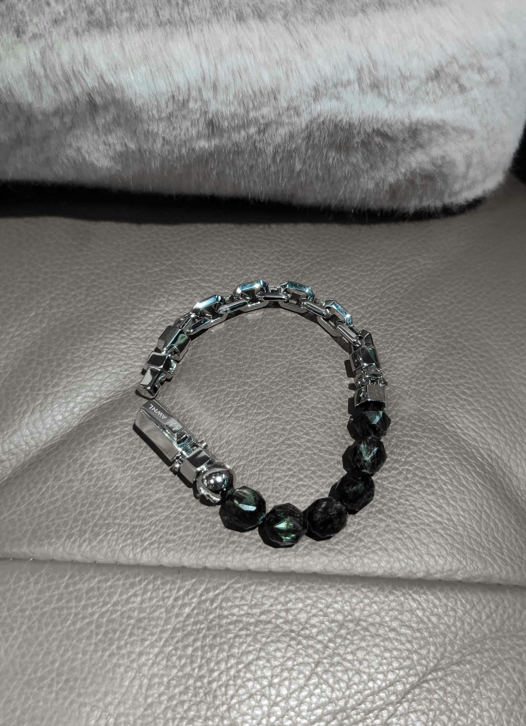 手環的結構設計體現了二元論的平衡美學。一半是人工的確定性,一半是自然的隨機性;一半是工業的冷峻,一半是原始的溫度。這種刻意的對比提供一種觸覺上的哲學體驗——當兩種截然不同的材質同時接觸皮膚,佩戴者會不自覺地思考這種並置關係。