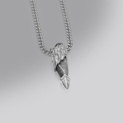 銀曜石尖錐如同穿透雲層的黑色閃電,與純銀鑄造的天使之翼並置,形成鮮明的視覺張力。翼片紋理精細可辨,每一處細節都經匠師手工雕琢,呈現羽毛自然的輕盈感與金屬特有的堅韌性。