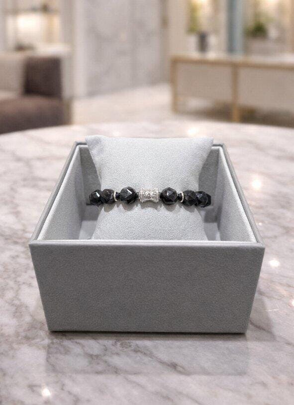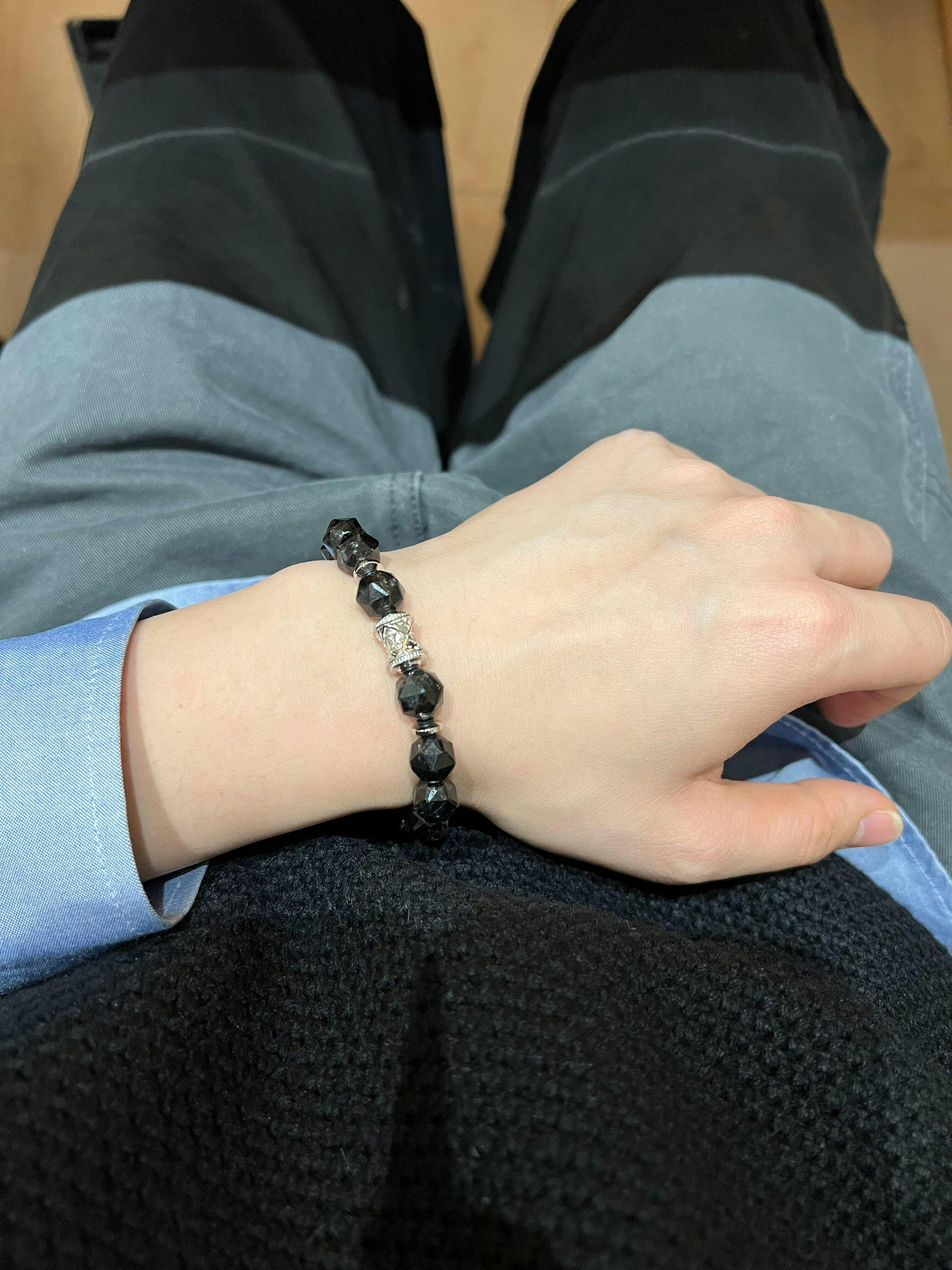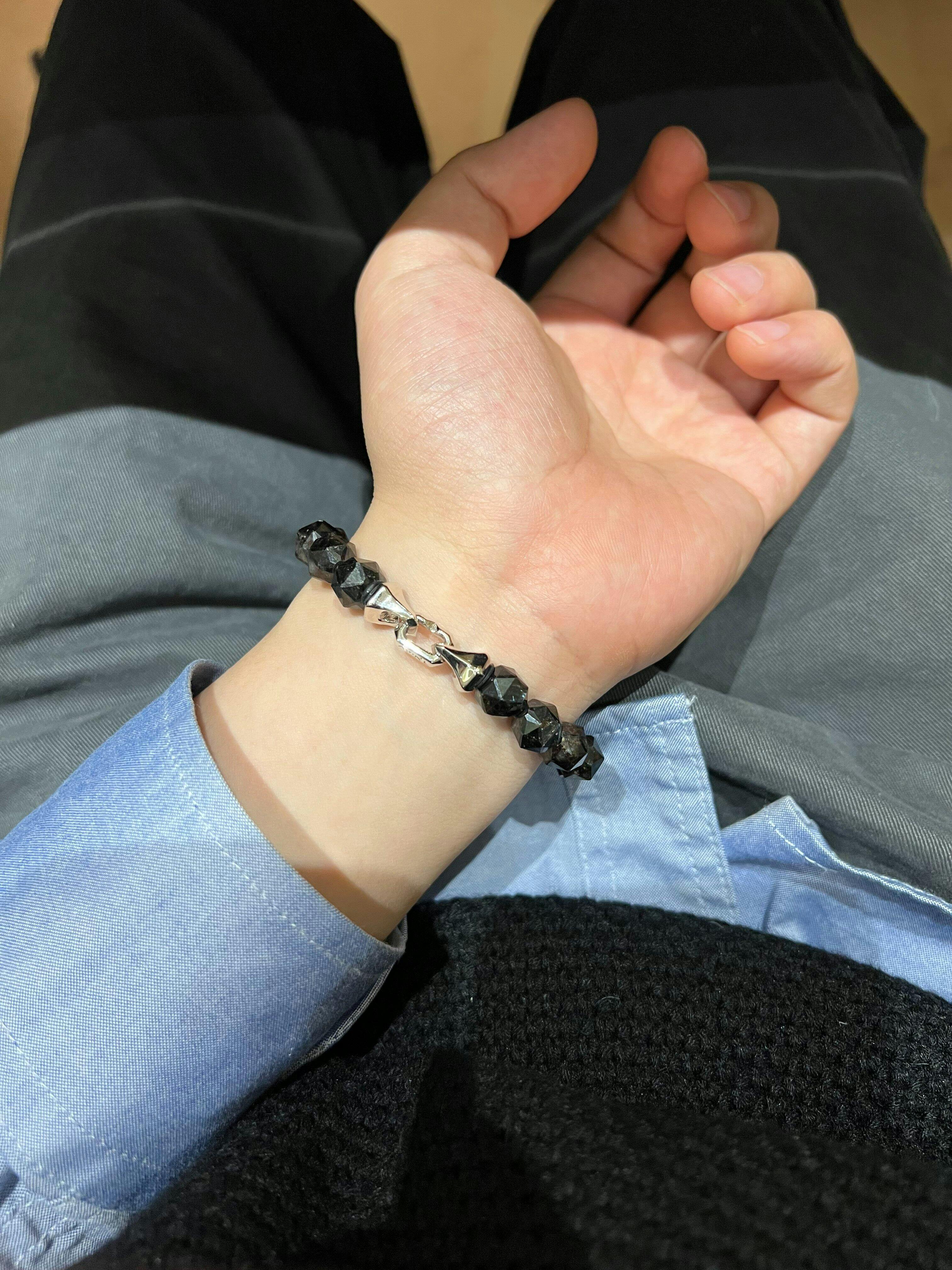手鍊的核心是來自格陵蘭島的努烏邁特滾石,這種形成於30億年前的稀有寶石,是地球最古老的寶石之一。在光線下透過84面鑽石形切割展現出神秘的雪勒效應,那種深沉中閃爍的彩虹光澤,如同北歐冰島黑沙灘上的神秘光影。努烏邁特在北歐傳統中被視為具有強大的能量場,據說能增強佩戴者的直覺力與自我意識。