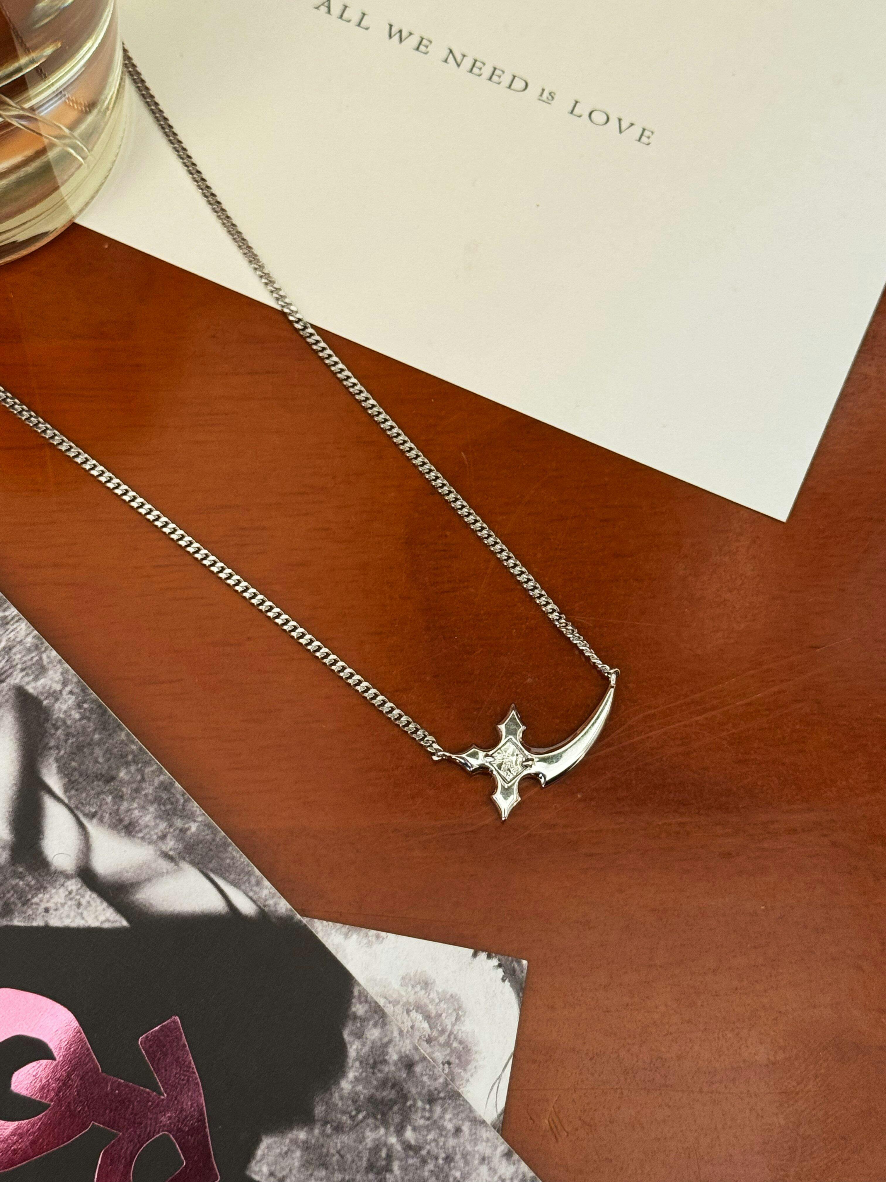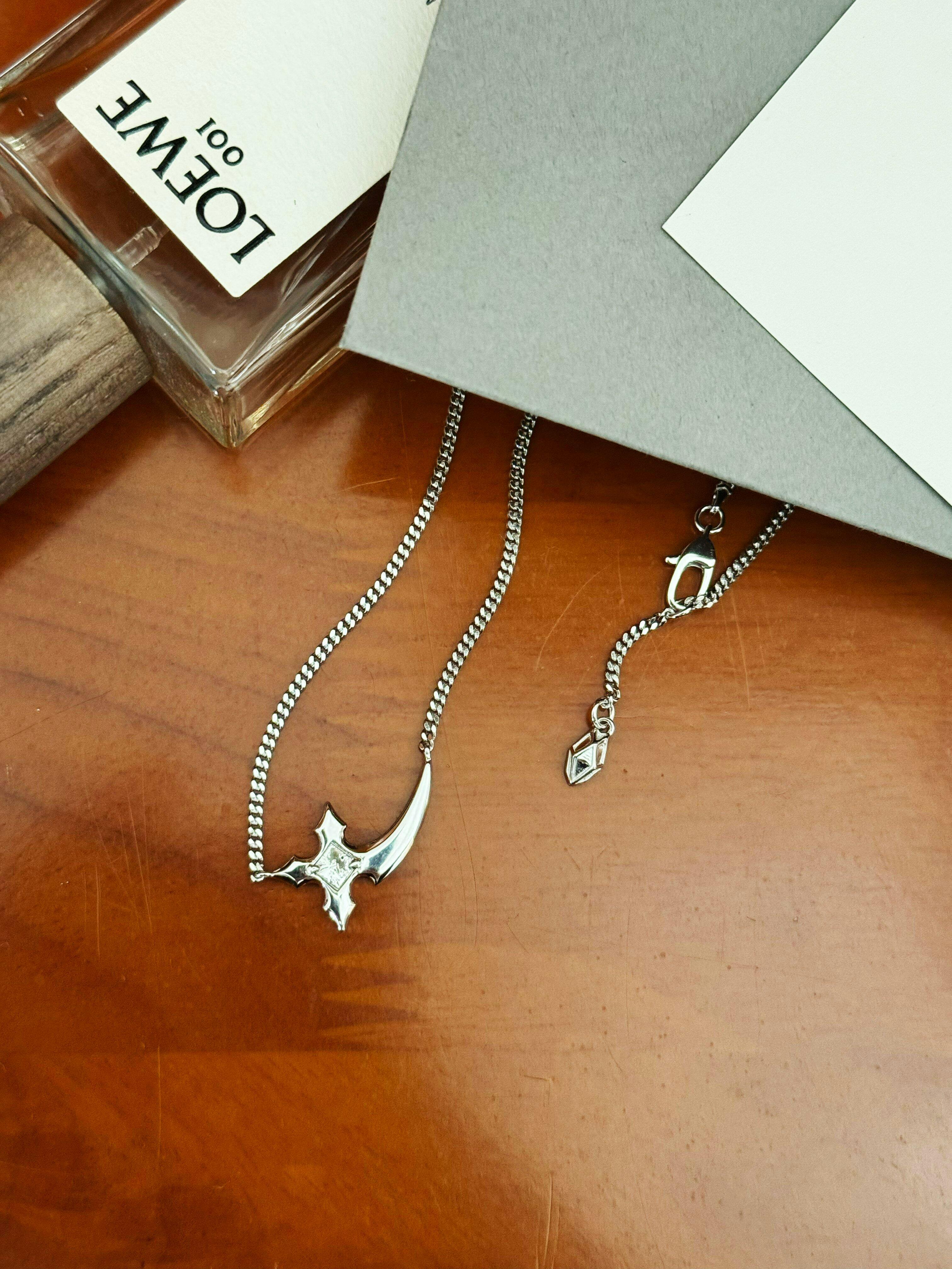 S925 純銀經鏡面拋光,稜線清晰。墜飾採用傾斜懸掛設計,讓整個結構呈現不對稱的視覺張力。隕石以爪鑲方式固定在戈身上,金屬爪的結構感與隕石的天然紋理形成對比。