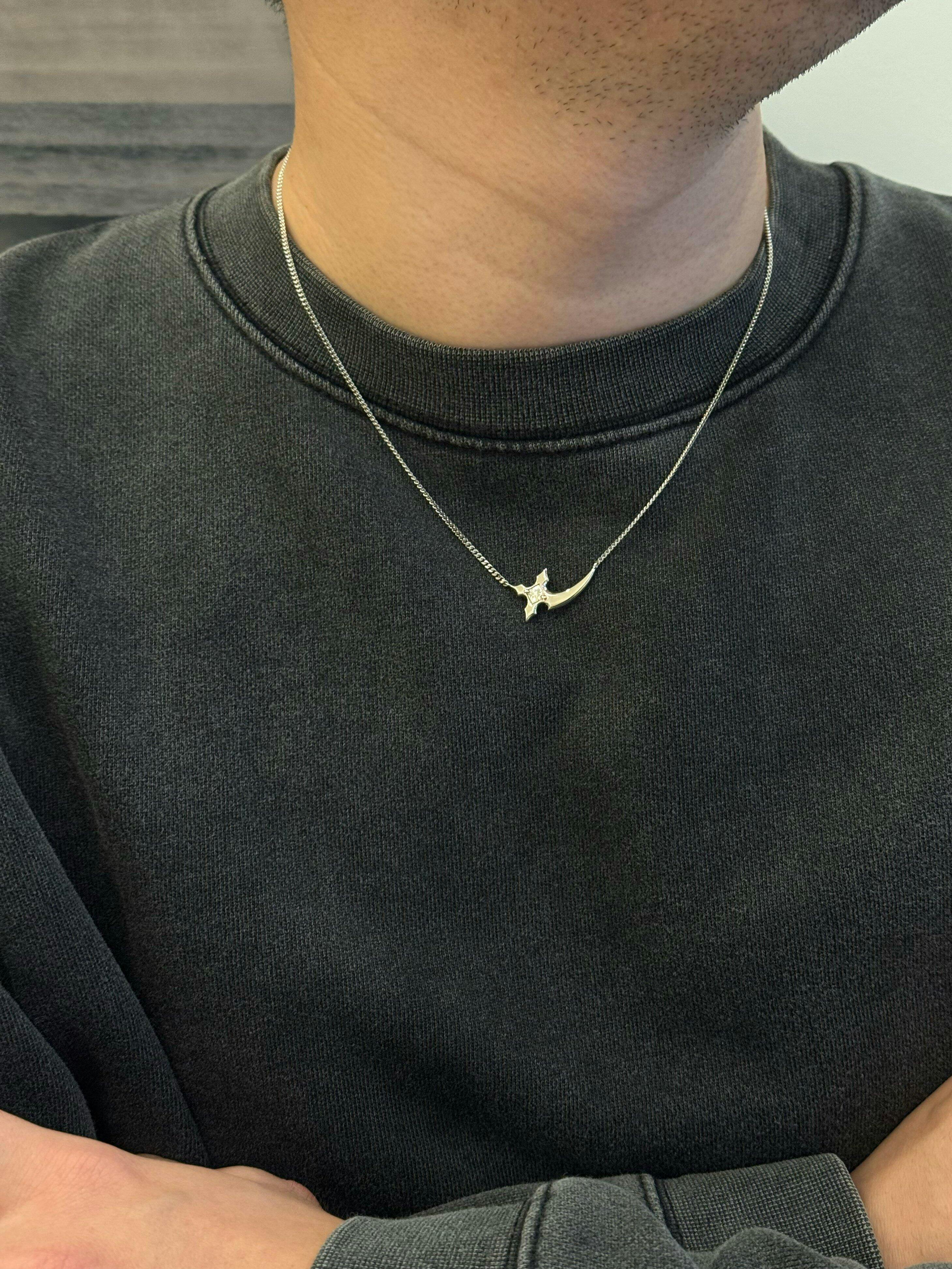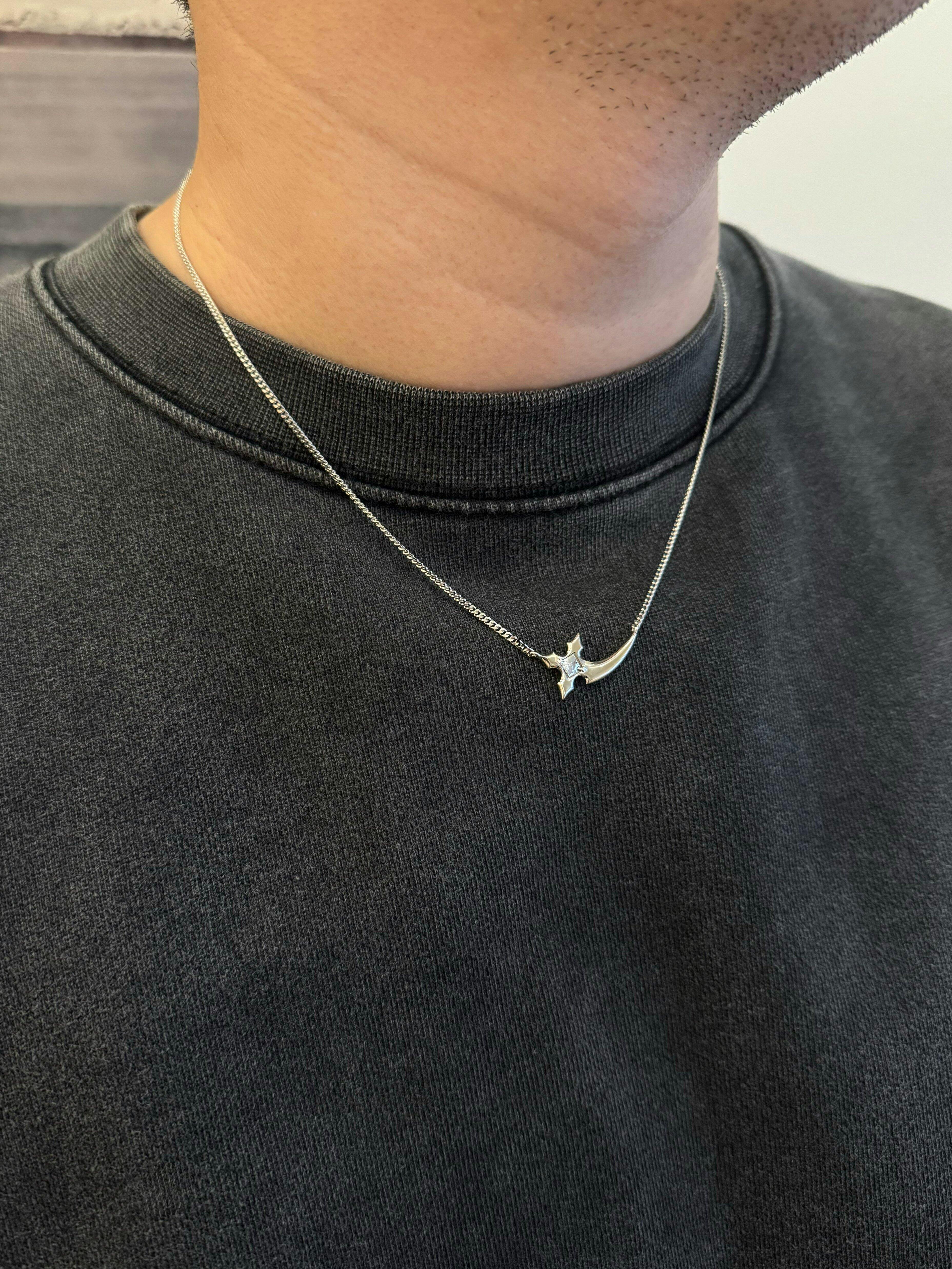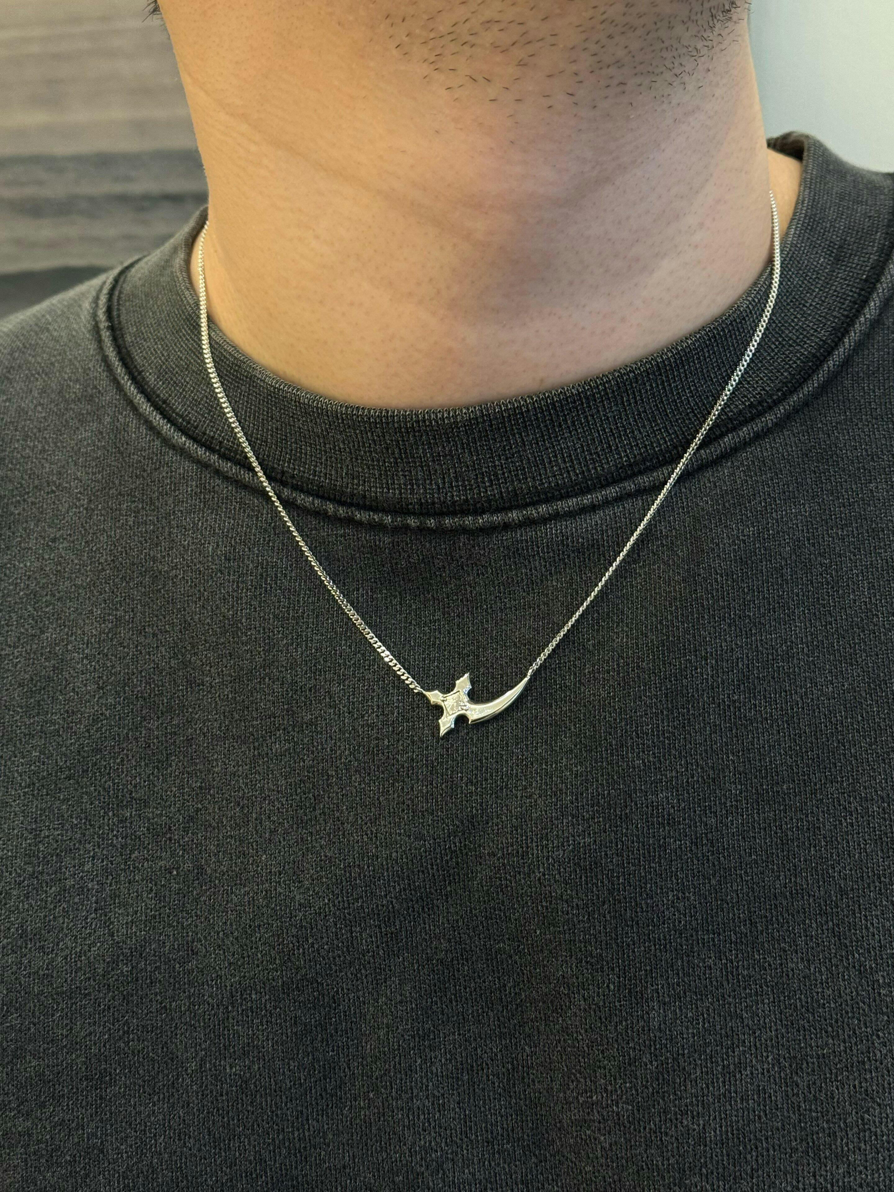 鏈身採用古巴鏈,鏈節經斜角切割處理。光線在每個環節上流動時,能看見連續的反光。墜飾貼合鎖骨線條,隨身體動作會有細微的擺動。