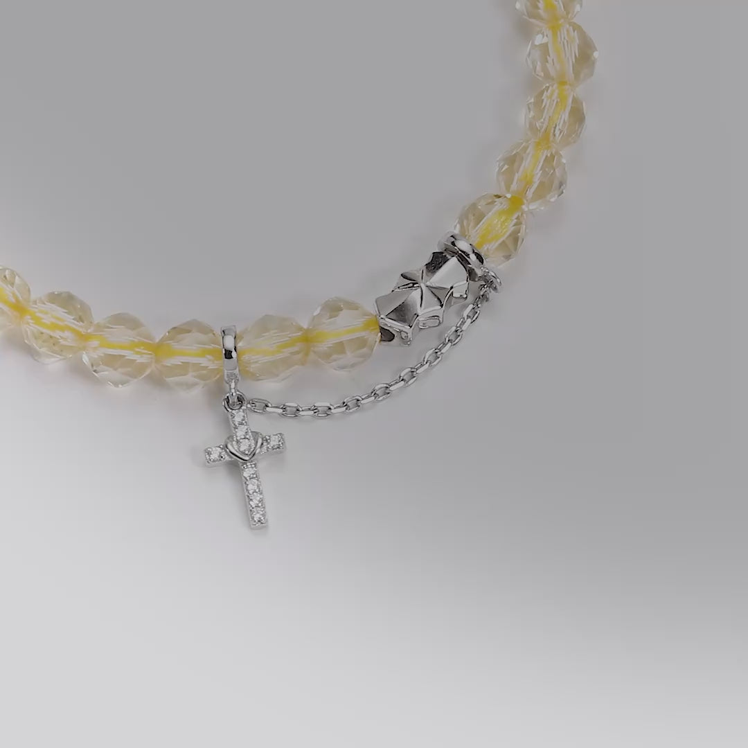 跨越時代的守護意志,於腕間靜靜綻放。此款手鍊以「守護」為創意軸心,將古老文明中的十字架圖騰,化為北歐極簡語彙下的堅定符號。巴西黃水晶如晨曦初照,濃金色光線在腕間流動,象徵富足、希望與不被撼動的內在定力;搭配S925純銀厚鍍18K白金,色澤清朗,質地沉穩,彷若為佩戴者鋪上一層無形的護盾。