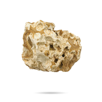 珊瑚化石,又稱菊花石,形成於億年前的海洋生物經過漫長時光玉化而成。每塊石材紋路獨特,如同指紋般無法複製,其白色基調象徵純淨,而內部細緻紋路則代表生命的複雜性與美感。