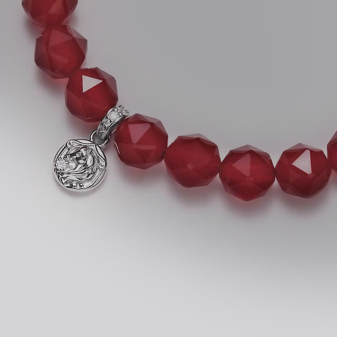 主體是巴西天然紅瑪瑙串珠。每顆都經過多面切割,讓表面能夠折射光線。紅瑪瑙是半透明的,這串選用色澤飽滿的深紅色。觸感溫潤,戴久了會有溫度。傳統上,紅瑪瑙被認為與熱情和活力有關。