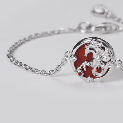 細緻的銀鍊為主體。中央是 S925 純銀全手工浮雕打造的圓形主件,刻畫奔騰靈馬的形態。正面鏡面拋光,背面噴砂處理,形成光面與霧面的對比。高折射方晶鋯石與紅石榴石鑲嵌其上,光線在不同角度會產生變化。